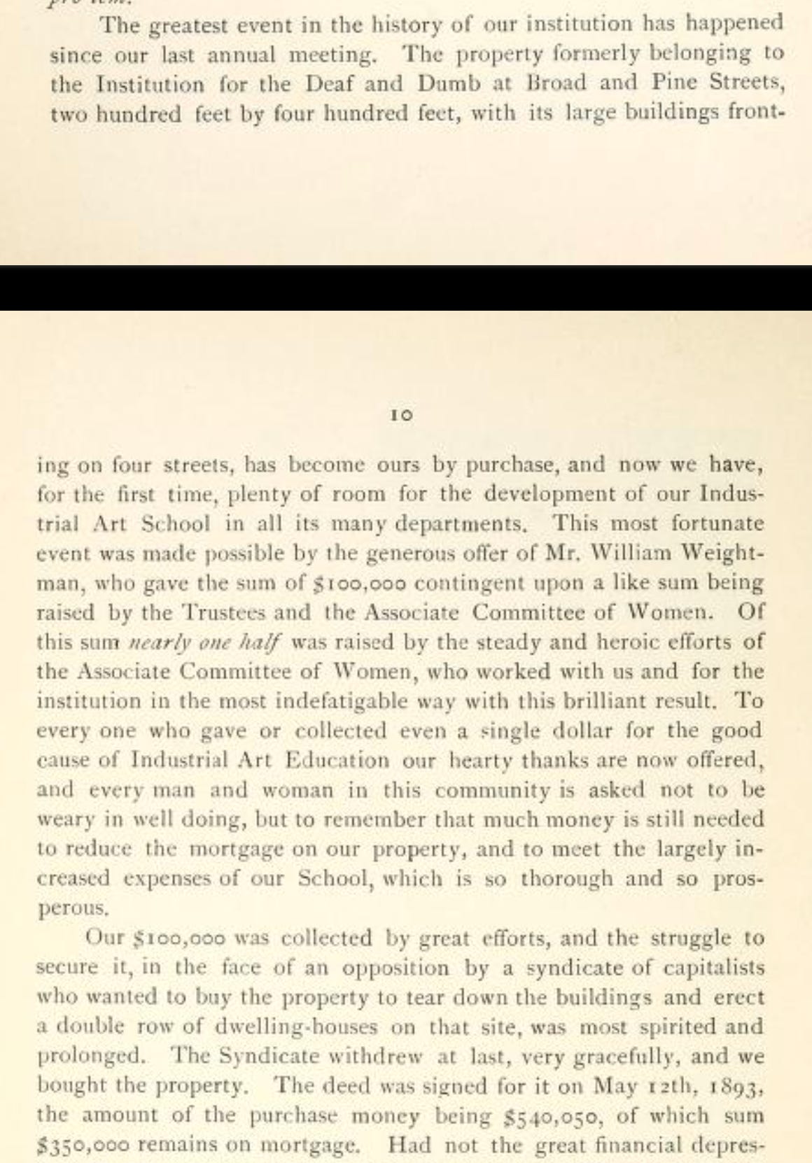 What!! The City of Philadelphia never gave UArts a building for a dollar. The Pennsylvania Museum School of Industrial Art (PMSIA, founded 1876), the original name of the UArts art school, purchased what I now think of as the John Haviland/Frank Furness complex at 320 South Broad Street in 1893 from the Pennsylvania Institution for the Deaf and Dumb (today’s Pennsylvania School for the Deaf). As a matter of fact, according to the PMSIA annual report for 1893 pictured below, it was considered “the greatest event” thus far in PMSIA’s history.